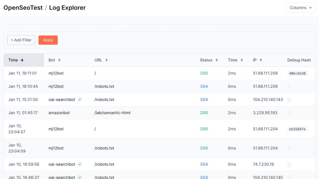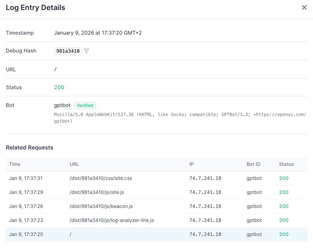 The platform features a real-time Log Files Analyzer. By submitting a generated test URL to a bot (e.g., via a ChatGPT prompt or a Google Search Console inspection), researchers can immediately inspect the server logs. This reveals the exact sequence of resource requests, providing hard data on whether the bot executed the JavaScript or merely parsed the initial HTML.